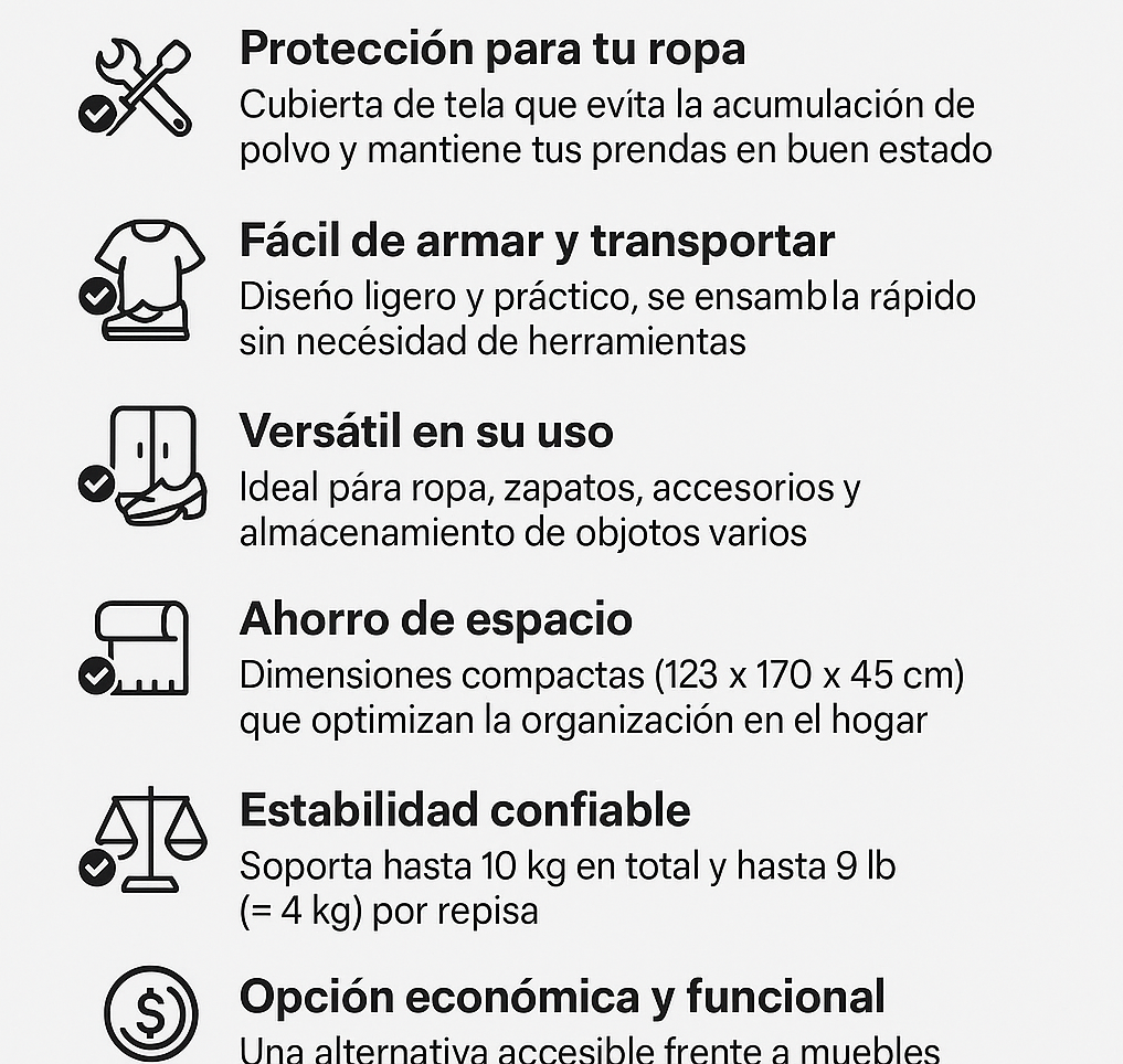 “⭐⭐⭐⭐ Muy práctico y ligero. Lo armé rápido y es perfecto para organizar la ropa sin ocupar espacio.” -